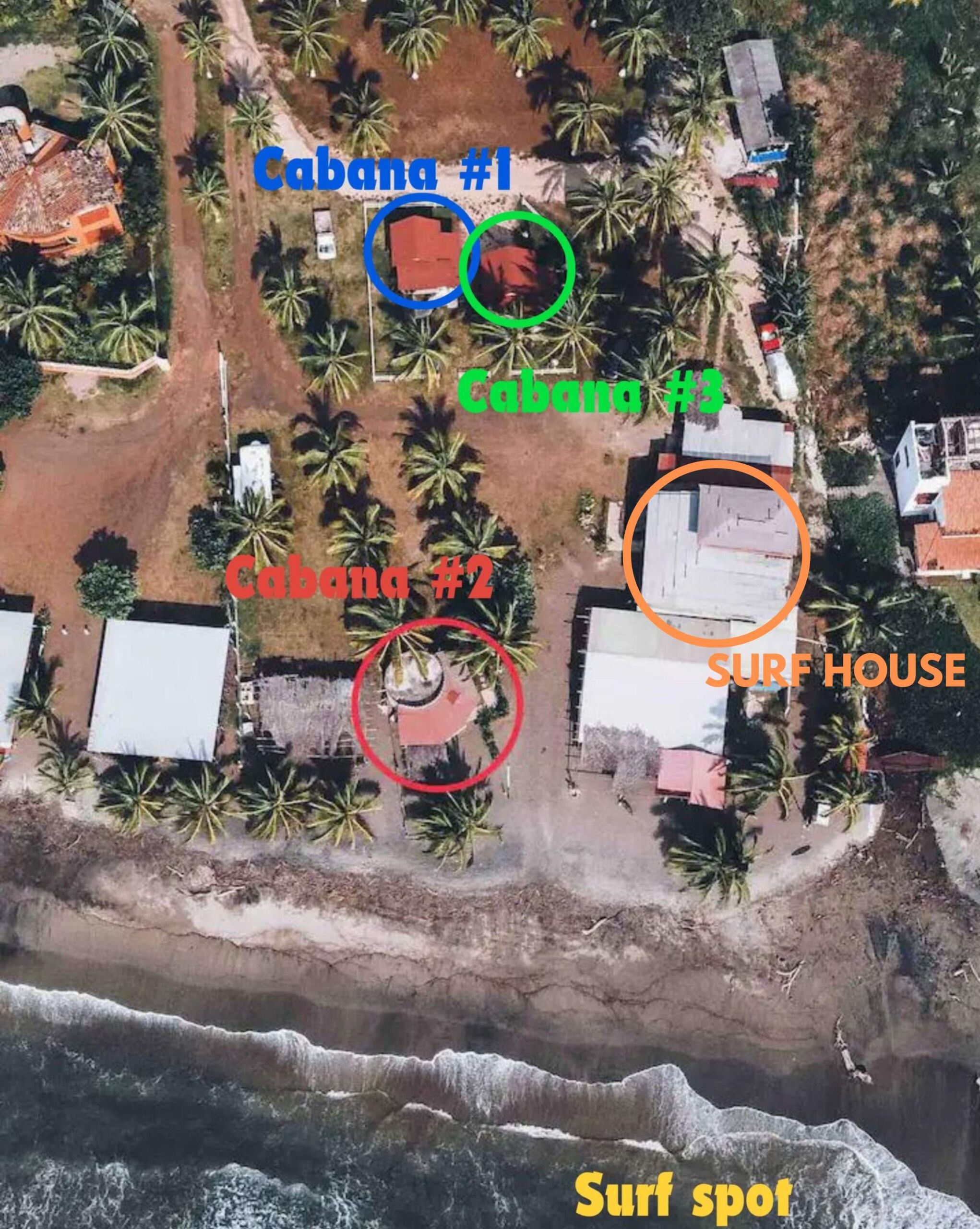 For the retreat of December 28-January 3, the accommodation will be in the SURF HOUSE (noted in orange below) and not in the bungalows. There will be only 4 spots available for this retreat, two spots in a shared room with shared bathroom (at 2600 USD) and two spots in private rooms with shared bathroom (at 2700 usd).